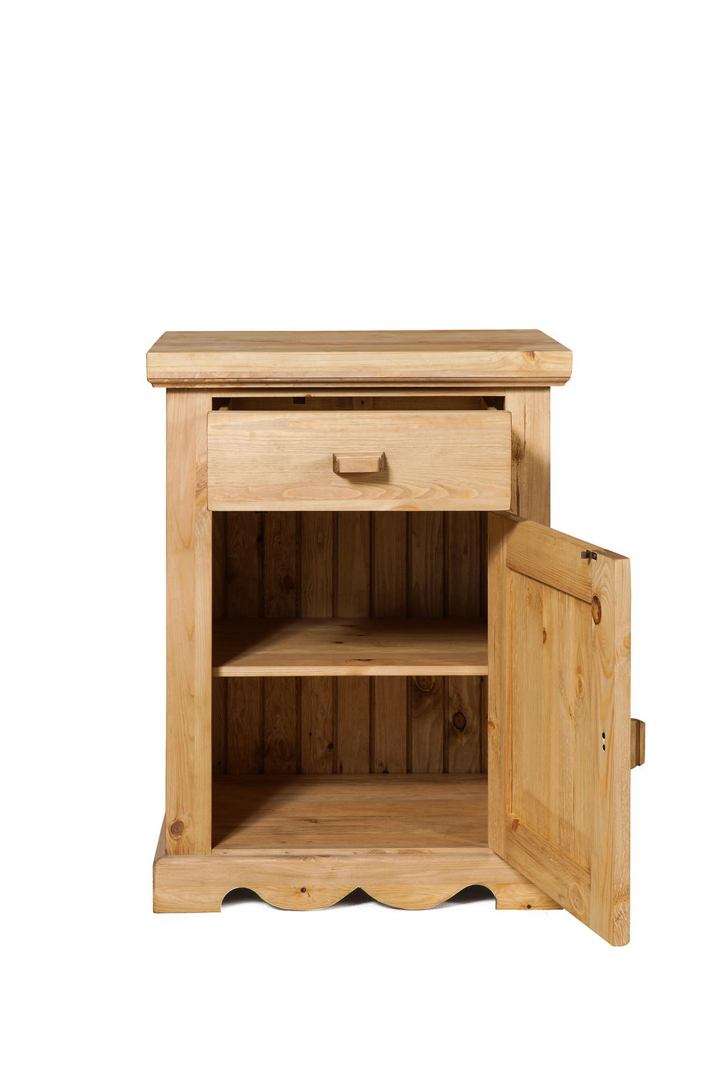 Корпус, ящик, полка и дверцы изготовлены из массива сосны.