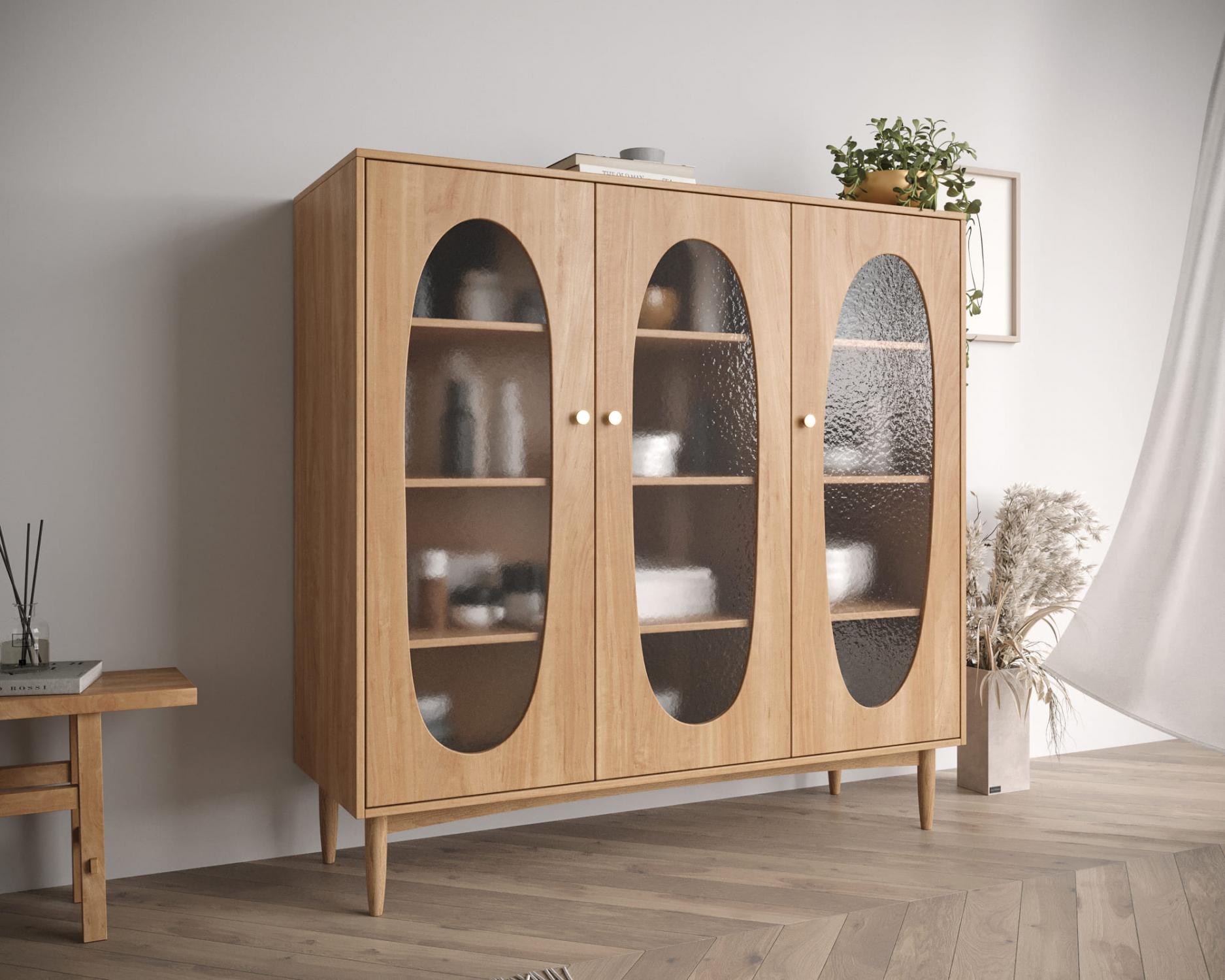 Корпуса и ящики изделий изготавливаются из ЛДСП марки Egger, ножки из массива березы, а фасады из МДФ. Все модели имеют вставки-окна из матового стекла. Мебель на высоких ножках можно не сдвигать во время уборки. Дверцы навешиваются на петлях со встроенными доводчиками для мягкого закрывания. Выдвижные ящики устанавливаются на направляющих шарикового типа.