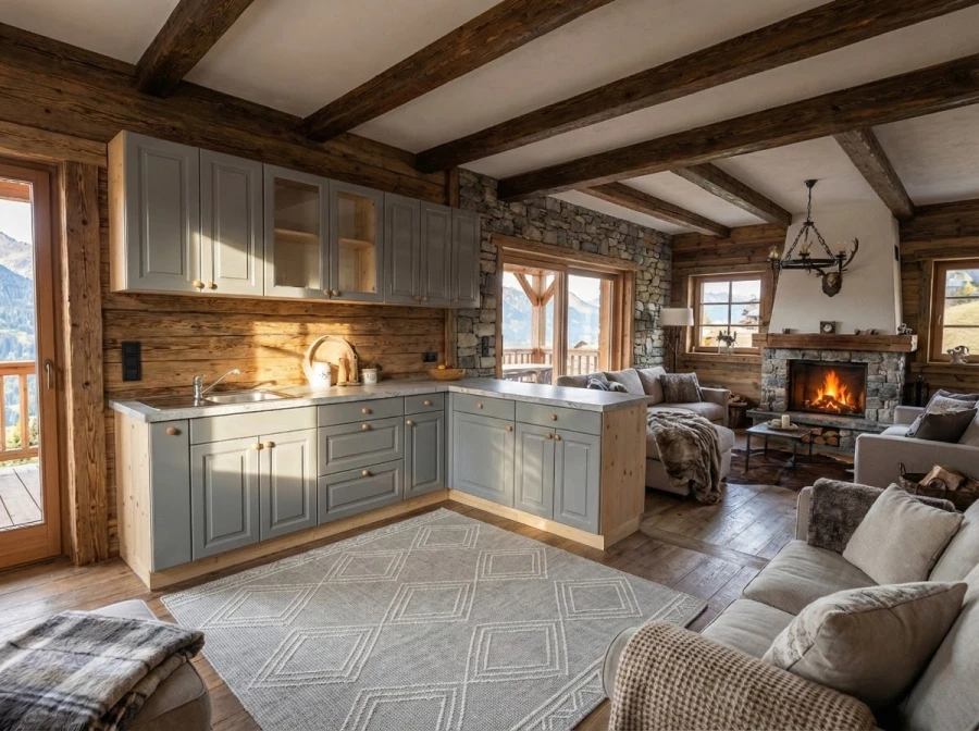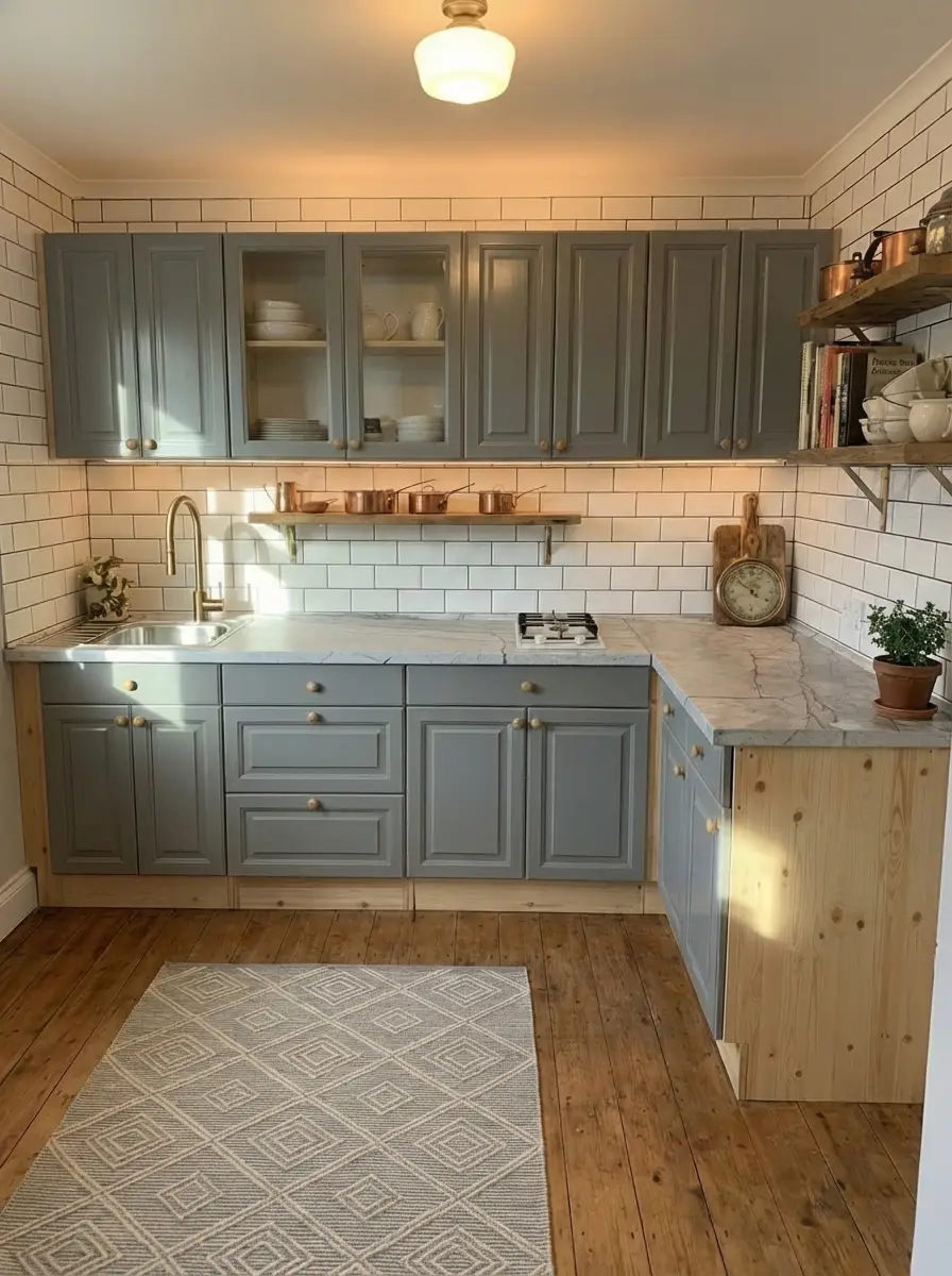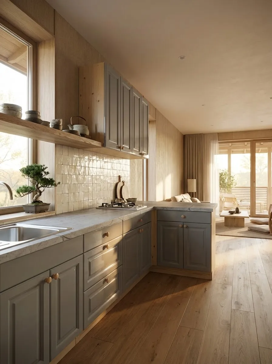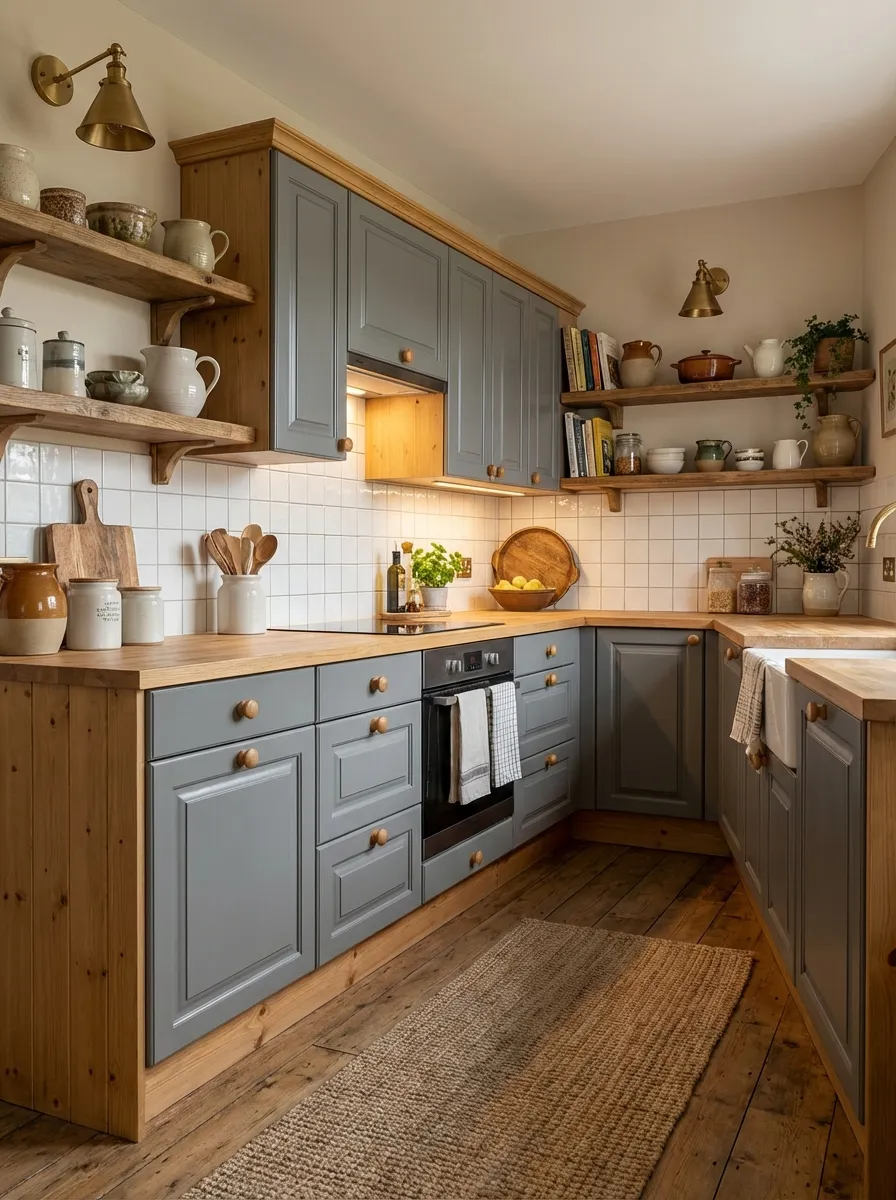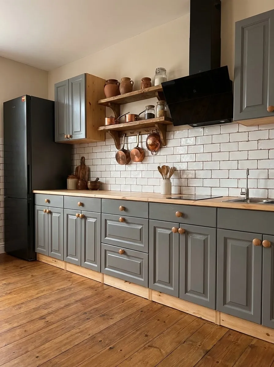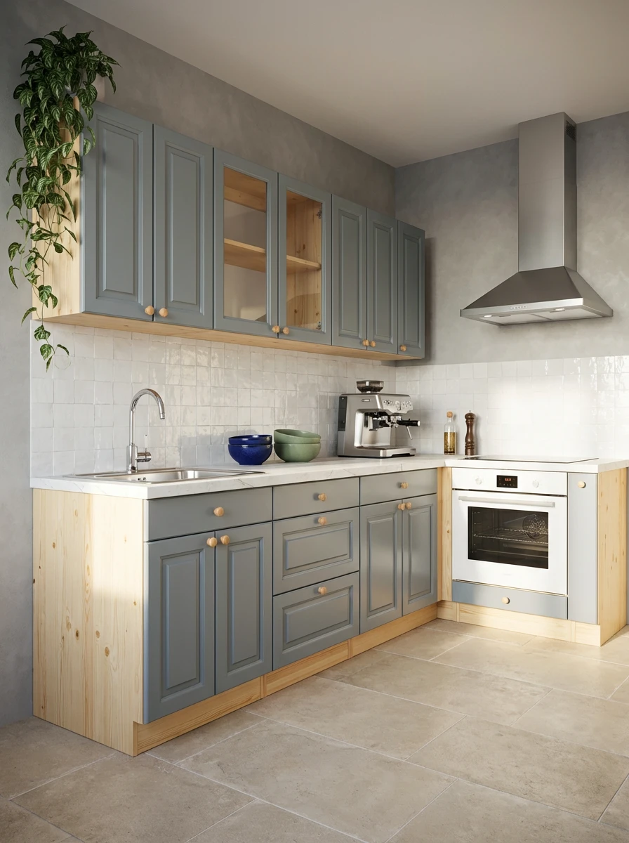 Кухня «Грей» – это модульная система для создания функционального и стильного кухонного пространства: напольные тумбы под мойку и духовку, шкафы с ящиками и дверцами, настенные полки и угловые элементы из массива карельской сосны. Толщина мебельного щита составляет 20 мм. Задние стенки и днища ящиков выполнены из оргалита для дополнительной жёсткости конструкции. Корпуса покрыты прозрачным лаком, бережно сохраняющим природную текстуру дерева, а фасады — в благородном сером оттенке, что создаёт выразительный контраст и современный образ интерьера.