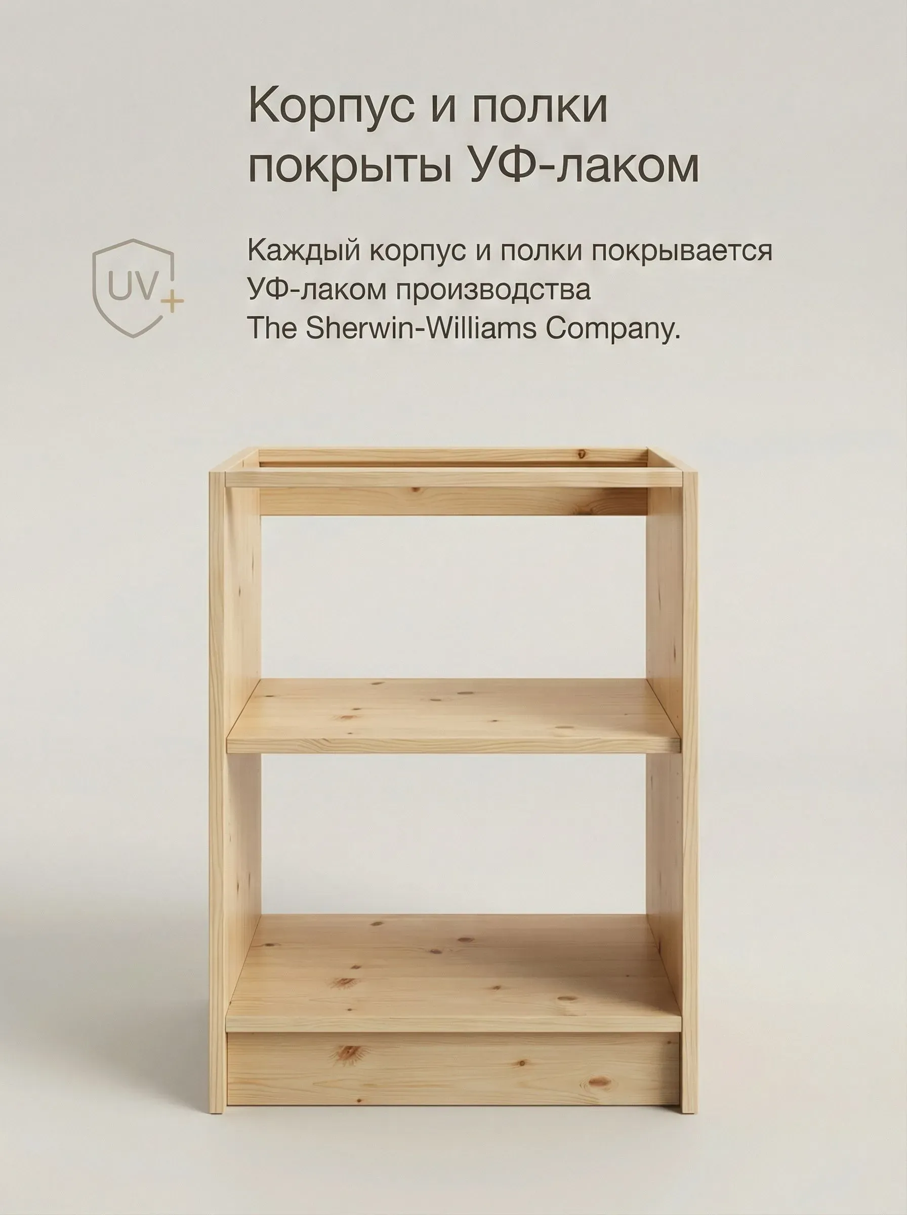 Он изготовлен из высококачественного мебельного щита толщиной 20 мм, прочный и долговечный. Для изготовления фасада используется бессучковый массив, который отбирают вручную. Фасад покрывают НЦ-лаком от итальянского производителя.