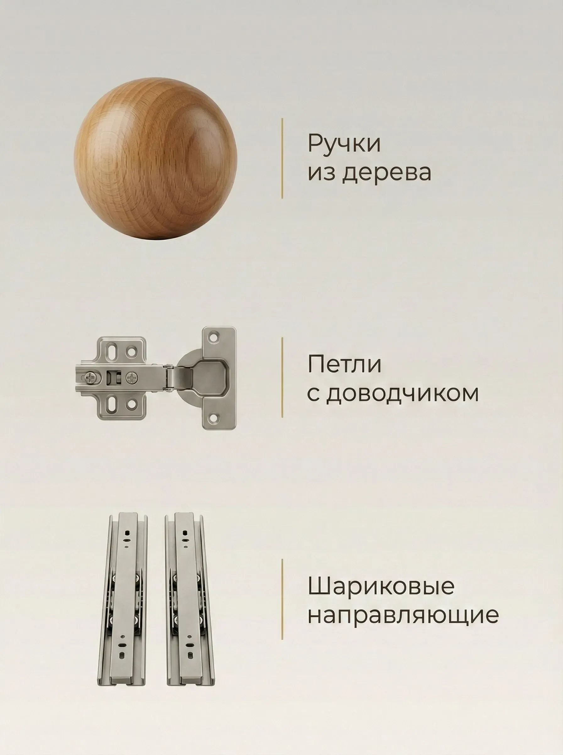 Отделка УФ-лаком от крупного производителя The Sherwin-Williams Company (всё, кроме фасадов) и итальянским НЦ-лаком (фасады) придаёт шкафу элегантный и современный вид. В комплекте идут удобные деревянные ручки-кнопки.