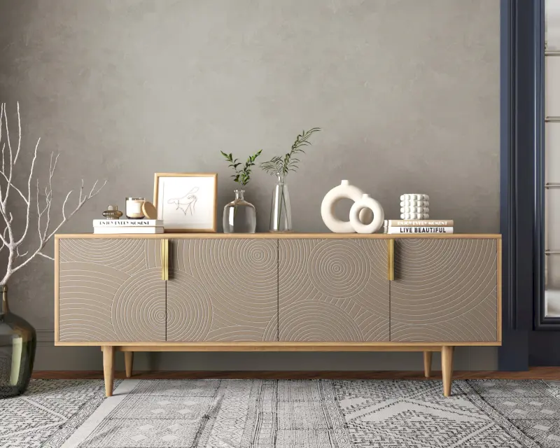 Все предметы имеют высокие ножки и не утяжеляют интерьер, кроме того, удобно вытирать пыль, не передвигая мебель. На фасады нанесены простые, приятные для глаз орнаменты. При изготовлении используются разные материалы: массив натурального дерева (ножки), ЛДСП (корпуса) и МДФ (фасады). Ручки имеют стильное состаривающее покрытие.