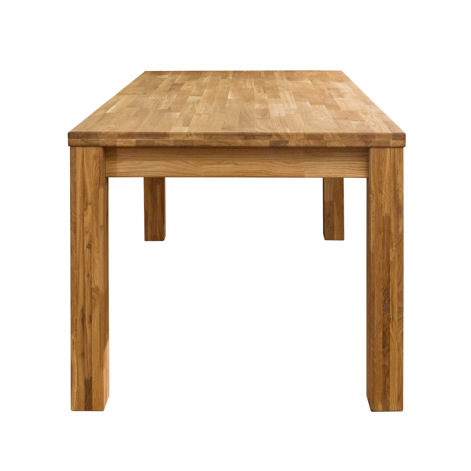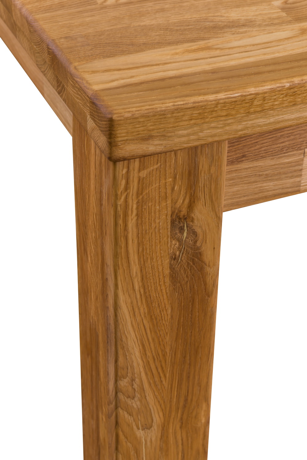 Стол изготовлен из натурального и долговечного материала – массива дуба, при этом сохраняется природная древесная текстура. Доступно шесть вариантов отделки: бейц-масло, дуб отбеленный, дуб паркетный, дуб венге, тёмная вишня и итальянский орех. Вы можете выбрать тот вариант, который лучше всего подойдёт к вашему интерьеру. Столик имеет устойчивые массивные ножки 90х90 мм.