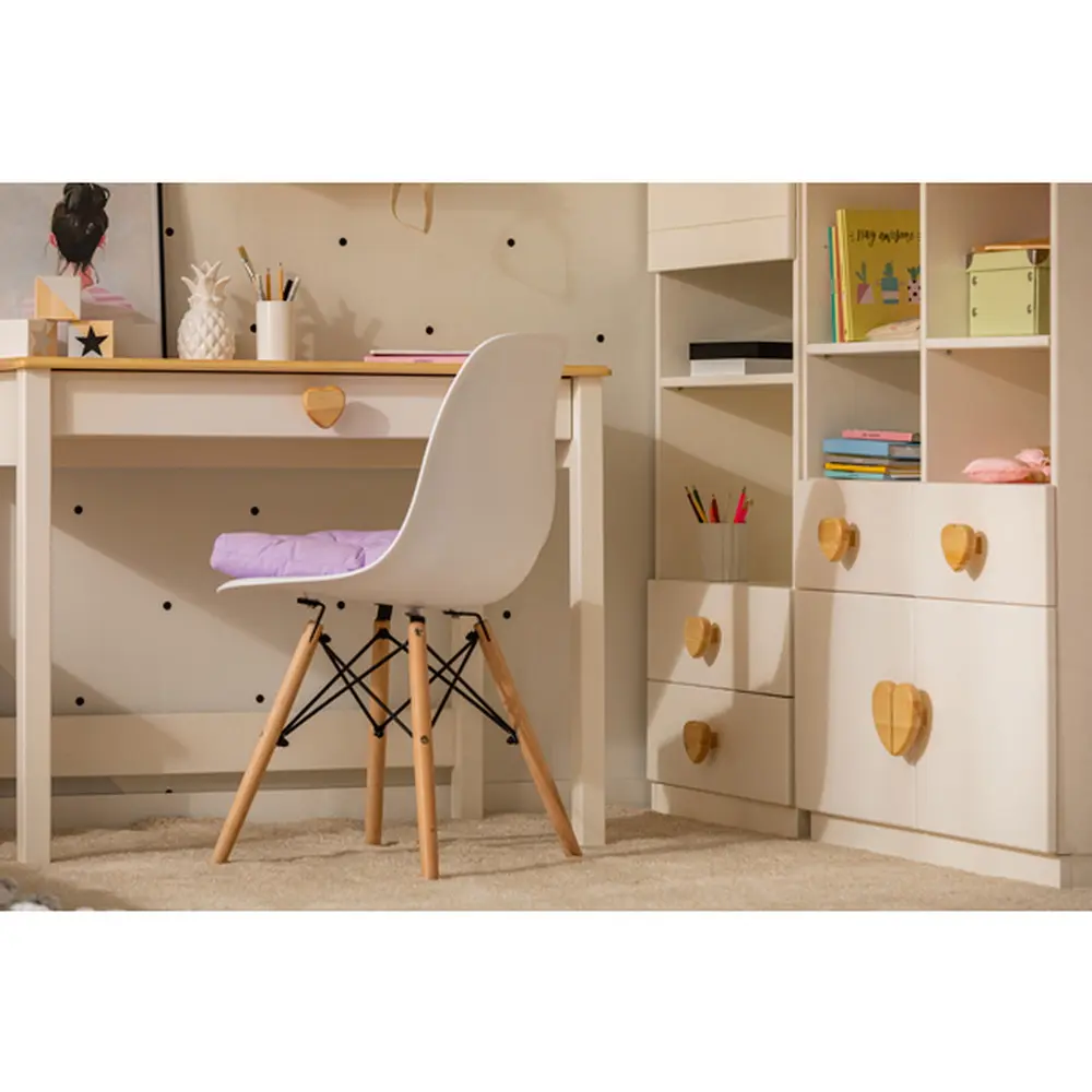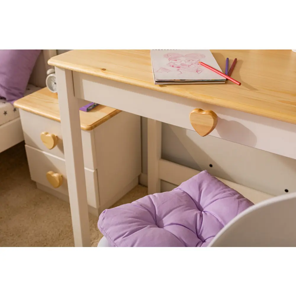 Вы можете выбрать тип ручек: «кнопки» разной формы (кружки, сердечки, квадраты) или просто запилы на ящиках и дверцах. Ручки деревянные, что придаёт столу особый шарм.