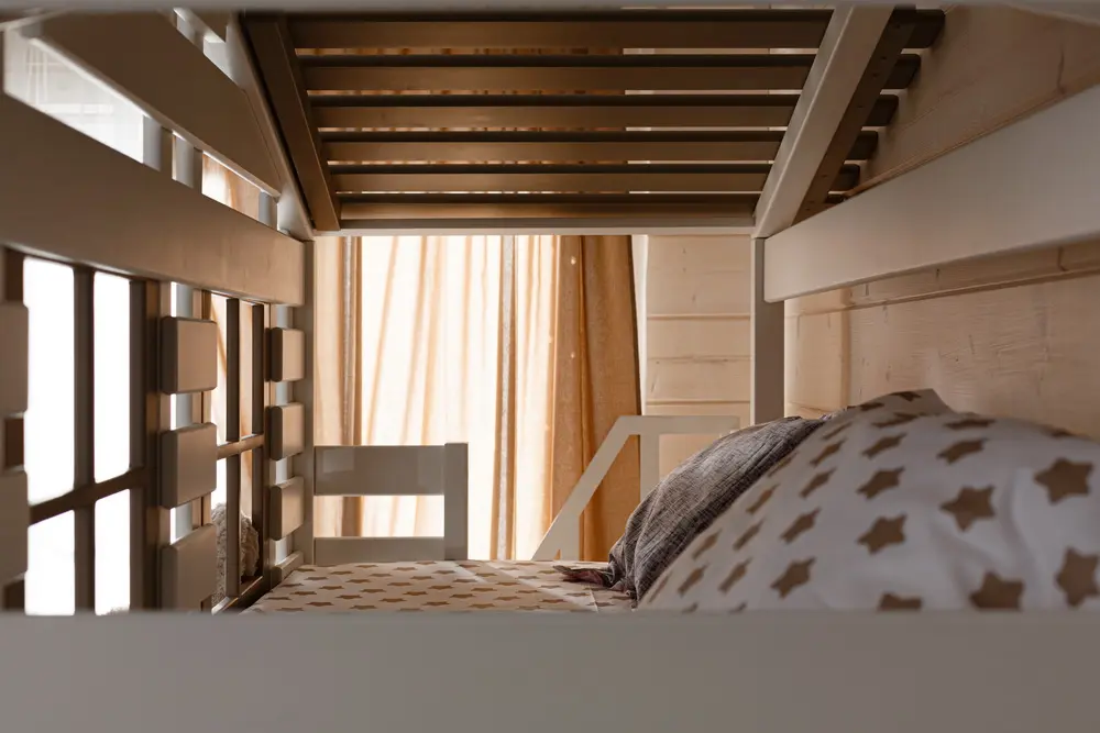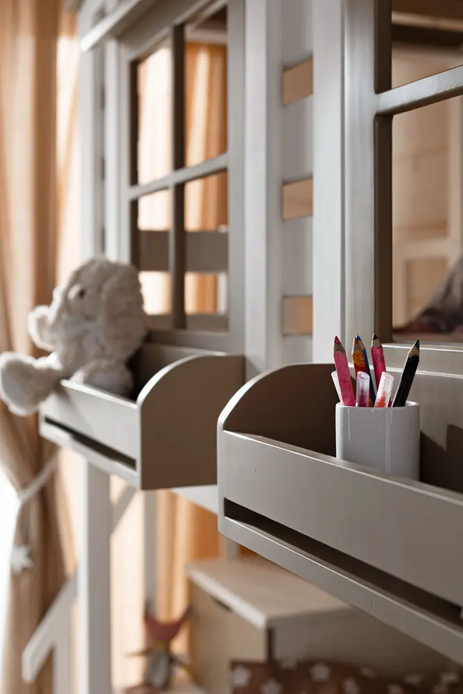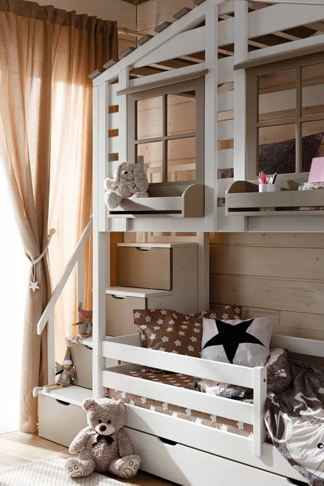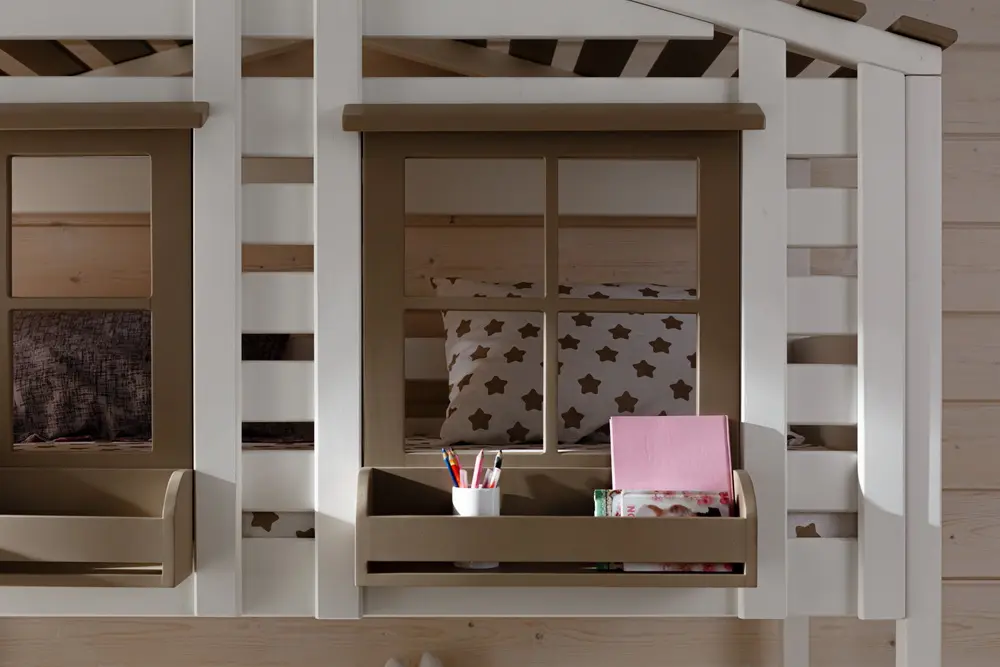 Кровать-домик имеет два яруса, что позволяет разместить двух детей или использовать верхний этаж как пространство для игр.