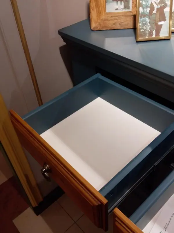 Материал - сосна, задняя стенка, дно ящиков - ДВП белого цвета, вставки в боковинах (филенка) - фанера (6 мм).