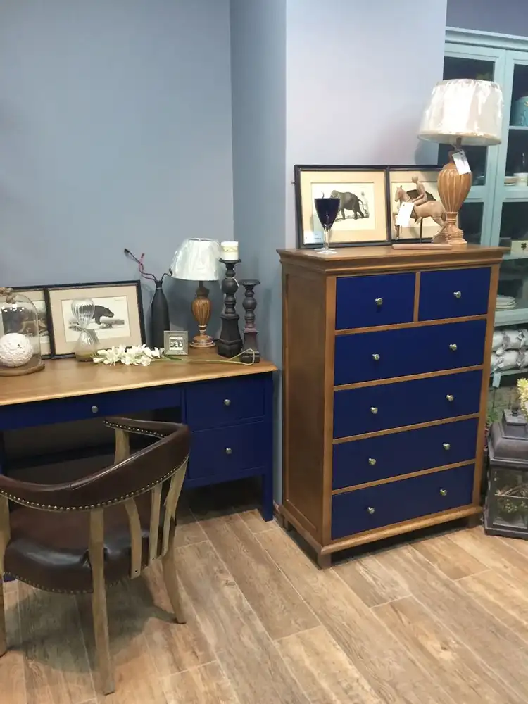 Мебель этой коллекции изготавливается из массива березы и массива ясеня, отдельные элементы выполняются из МДФ. Предлагается два базовых цвета – синий и серый, также возможна окраска по таблице RAL в любой выбранный цвет. Ящики и дверцы могут быть дополнительно оснащены доводчиками для плавного закрывания.