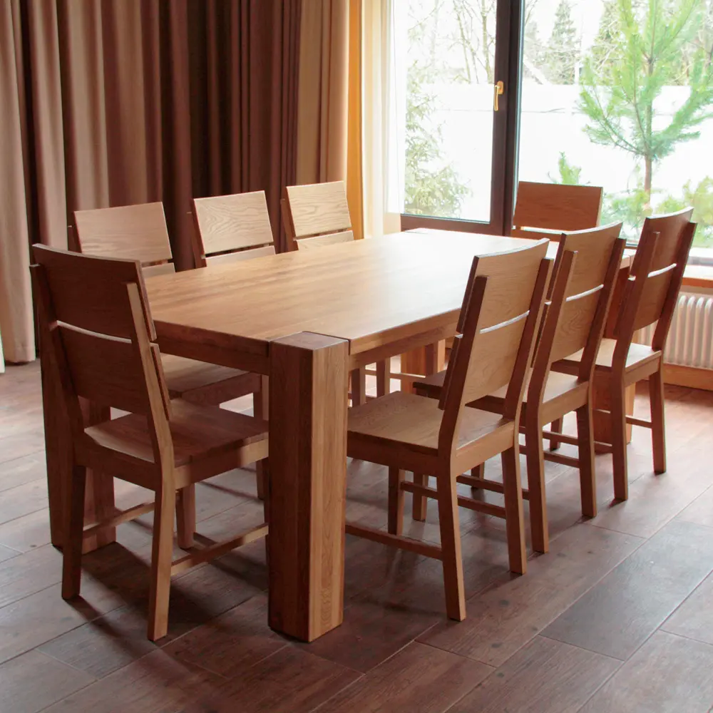 Стол обеденный 1600*900*750 столешница с фальшпанелью (фальшпанель - декоративный элемент визуально увеличивающий толщину столешницы), Сечение ног стола 90*90 мм , столешница толщиной 40 мм. Стол изготовлен из натурального массива дуба. Особенности: в изготовлении используется цельноламельный щит.