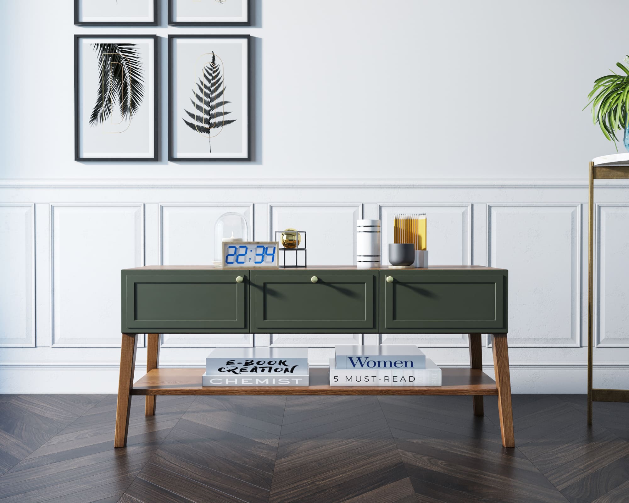 Три оригинальных фасада приятного зеленого оттенка с прямыми рамками выигрышно смотрятся с ножками из массива ясеня в цвете орех.